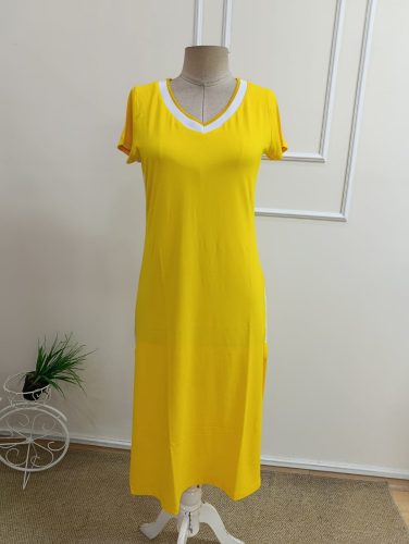 Kadın kısa kollu v yakalı yandan şerit ve yırtmaçlı viskon uzun elbise
